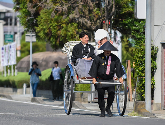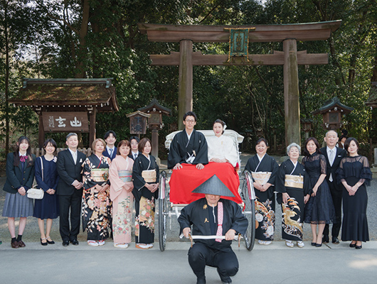 新郎新婦様のお支度が完了致しますと人力車で二の鳥居へと向かいます。