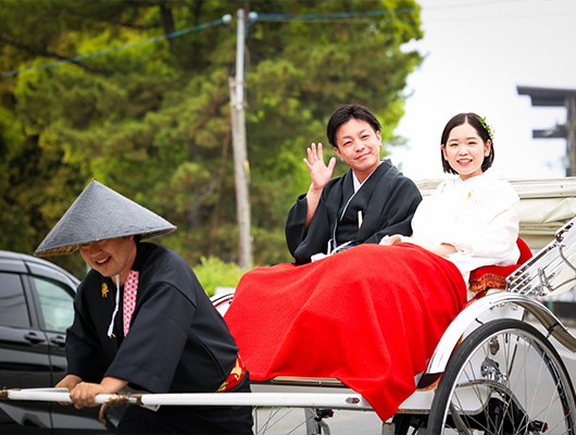 人力車で到着する新郎新婦様を皆様にお出迎えいただきます。