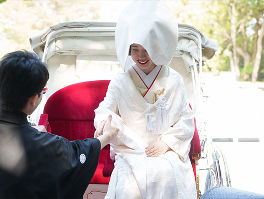ご用命いただいた皆様は弊社手配のタクシーで神社控室にお送り致します。ご自身でお着替えがある方は神社美粧室をご利用下さい。